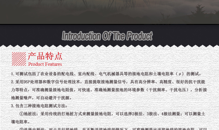 ①地樁法:采用傳統(tǒng)的打地樁方式來測量接地電阻,可以選擇2極法、3極法、4極法測量;可以測量土壤電阻率。