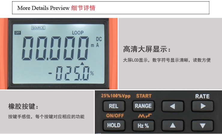 ?* 輸出直流電流時,可同時顯示mA和%值;25%和100%的手動步進、自動步進及自動斜坡的電流輸出功能。