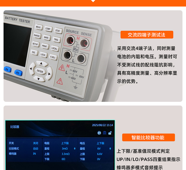 2、采用交流4端子法,同時測量電池的內(nèi)阻和電壓。測量時可不受測試線的配線阻抗影響,具有高精度測量、高分辨率顯示的優(yōu)勢。