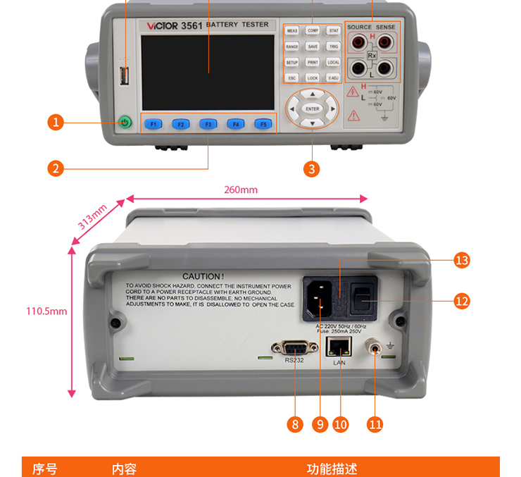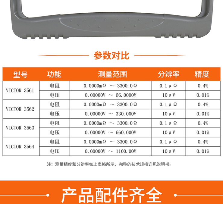 VICTOR 356X系列電池內(nèi)阻測試儀包含四個型號VICTOR 3561、VICTOR 3562、VICTOR 3563和VICTOR 3564,其測量電壓范圍分別為60V、300V、600V和1000V。測量精度和分辨率如下表格所示,完整的技術(shù)規(guī)格詳見說明書。