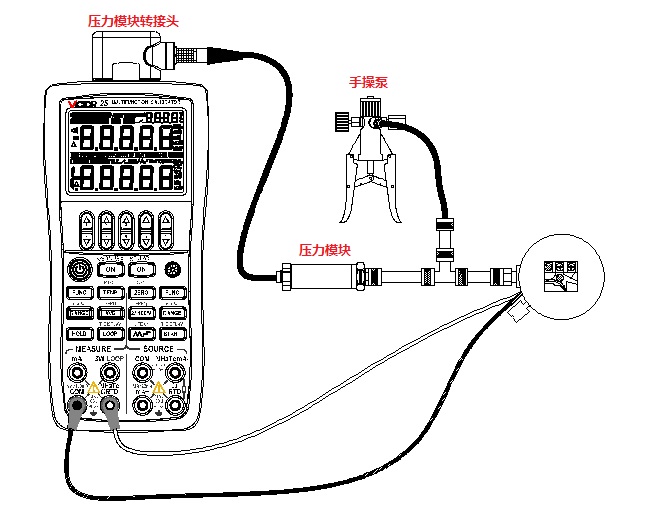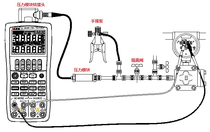將VICTOR 25的輸入設(shè)置為提供回路電壓同時測量電流,輸出設(shè)置為壓力,通過改變外部壓力源的輸出壓力,便可對壓力變送器進(jìn)行校準(zhǔn)。