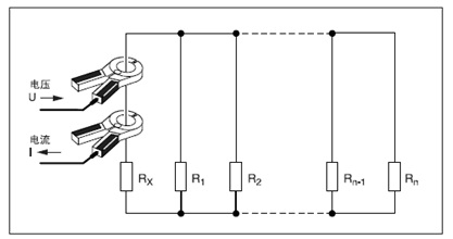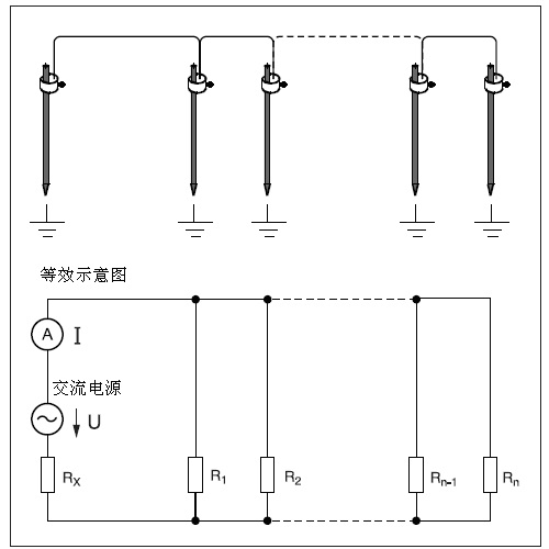 如果R1…Rn電阻的并聯(lián)連接遠(yuǎn)遠(yuǎn)小于所測(cè)接地電阻Rx: