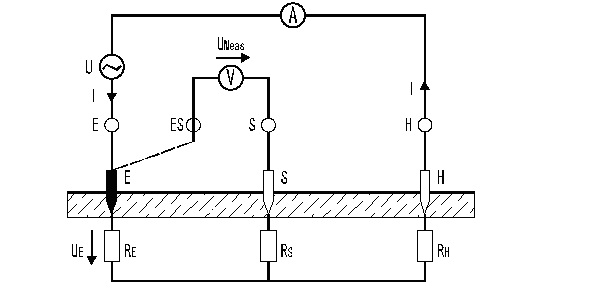 交流源U產(chǎn)生的電流I,流經(jīng)被測(cè)接地電阻RE和輔助接地電極RH,在流回電流源U。這樣被測(cè)接地電阻RE就有電壓Ue,它可通過(guò)探針S檢測(cè)和測(cè)量。由于電壓測(cè)量電路阻抗很高,可以忽略電壓極的電阻RS的影響。電流I通過(guò)內(nèi)部的電流測(cè)量電路測(cè)得。因此被測(cè)接地電阻RE=Ue/I。